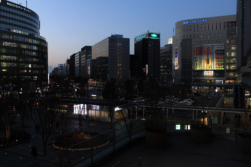 繁忙的福岡市區,建築物反射著天空的餘光,顯得特別潔淨。